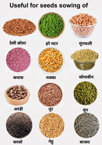 Pro seeder is seed sowing machine two rows made of heavy plastic body material and metal rod . Made in India machine seeding machine suitable for big size seeds more than 5mm oval shapes or rounds like groundnuts, chana, matar, soya, toor, beens, castor, cotton seeds etc. Get this machine on yantratools with a very low price in market with quality service . This machine can operated by hand/ cows/tractors etc.